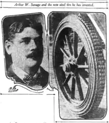 ![]() Newspaper photo Arthur Savage and a new steel tire, circa 1911 | |