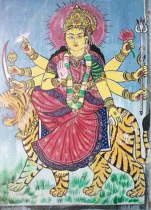 On the boulder of Ravanachhaya at Sitabhinji Group of Rock Shelters in Keonjhar district is a mural belonging to later Gupta period and shows resemblance to those of the Ajanta style.[2] From the period of 1600 to present murals were painted in the numerous templates of Odisha depicting sacred figures such as the painting of Buddha Vijaya in the Jagamohana of Lakshmi Temple and inside the Jagannath Temple at Puri, the Biranchinarayana Temple, in Buguda, Ganjam district and so on.[2]
