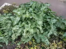 Arum italicum subsp. italicum is a morphologically variable subspecies.[1] Leaves often have various degrees of pale veining or blotching, although uniform green leaves also occur.[1] Spathe limbs are greenish to yellowish white, while the spathe tube is greenish white on the inside (sometimes stained with purple).[2] Spadix appendices are dark yellow.[2]