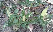Plants from the British Isles and the Atlantic coast of western Europe with deep green leaves and winter leaves differing in shape from spring leaves have been treated as a distinct subspecies, Arum italicum subsp. neglectum (F. Towns.) Prime.[2] Differences in germination (epigeal in subsp. italicum, hypogeal in subsp. neglectum) and phenology (subsp. italicum beginning growth earlier) have also been reported.[2] However, there are intermediate forms between the two subspecies, particularly on the European mainland, and there have been proposals to merge the two under subsp. italicum.[1][3]