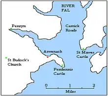Map showing location of Arwenack, today the location of the town of Falmouth. The Carrick Roads are the world's third-largest natural harbour