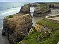 Praia das Catedrais (Spanish: playa de las Catedrales, English: Beach of the Cathedrals) is on the northwest coast of Spain. It is the name given by the tourism industry to Praia de Augas Santas (translated from Galician: 'Beach of the Holy Waters'). The beach is located in the Ribadeo municipality, in the province of Lugo (Galicia), on the Cantabric coast, and it lies about ten kilometres to the west of the town of Ribadeo. Its name is derived from its cliff formations.