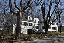 The Asa and Sylvester Abbot House stands in what is now a residential area, south of downtown Andover and the Phillips Academy campus, on the northwest side of Porter Road, just north of its junction with Karlton Circle. It is a 2+1⁄2-story wood-frame structure, with a side-gable roof, two central chimneys (one on each side of the roof ridge), and a clapboarded exterior. The front facade is symmetrical and six bays across, with entrances in the outer bays. Each entrance is recessed with sidelight windows, and the recess is framed by pilasters, entablature, and gabled pediment. Period single-story ells extend to either side, with later additions further extending the house in both directions.[3]
