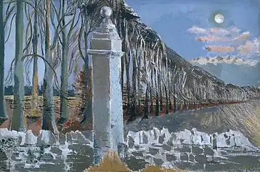 Ascott remained in the hands of the Fiennes family until the fifteenth century, including under the ownership of James Fiennes, 1st Baron Saye and Sele, a celebrated English soldier and statesman of the Hundred Years' War and Lord Chamberlain to Henry VI of England. By 1510, Ascott was in the possession of the Dormer family, and remained one of the seats of the family for many generations, alongside Rousham House.[4] A substantial house built by Sir William Dormer may have been attacked during a Parliamentarian raid on Ascott during the English Civil War in 1642, and subsequently burnt down. The site of this house forms part of Ascott park.[5] One of the gateway pillars of Ascott park is the subject of surrealist painter and war artist Paul Nash's 1932-1942 oil painting Pillar and Moon, while the gateway itself (as well as its wrought-iron gates) are held by the Victoria and Albert Museum and on display at the Bodleian Library in Oxford.[6][7][8]