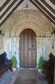 Lending its name to the village, St Mary's church was first built sometime before 1186,[19] in the late Anglo-Saxon era,[20] however, only the foundations of the original church still exists. The nave of the church is Norman, and still retains the typical long low features of a Norman church, the tower is 15th Century, but with later crenellations at the top. The chancel is post 13th century, and the south porch is 16th century, however most of the internal dressings date from the 17th century.[21] Situated in the north of Ashby St Mary, St Mary's church is notable for its Norman doorway, thought to have been carved by the same master mason as both Mundham's St. Peter, and Heckingham's St. Gregory.[22]