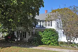 The five-bay front facade has two flat Doric pilasters and two more pilasters, located off the central bay support the broken base pediment.[3]:5 The original door was replaced with a 19th-century door that has a 20-pane fanlight and is flanked by two flat pilasters that support the broken base pediment over the door. The main house originally had two-chimney design and another chimney was added to the east wall for a 20th-century furnace. Most of the windows in the house were replaced in the 19th century with 2-over-2 sash, except for two attic windows of each end of the gable which retain the smaller paned sashes.[3]:2 The house includes an earlier 1+12-story ell in the rear that appears to have been a two-room central chimney structure that was integrated into the design of the main house and built in the second quarter of the 18th century.[3]:2,4 The chimney was replaced in the 19th century. A storage shed also sits behind the house. The property also had a dairy barn that was rebuilt following its destruction in the 1938 New England hurricane.[3]:2