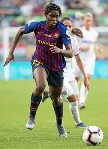 On 31 January 2019, Spanish club FC Barcelona Femení signed Oshoala on a loan deal until the end of the season.[30] On May 31, 2019, Barcelona announced her full transfer to the club and extension until 2022.[31] She scored seven goals in her seven appearances for the club during the 2018-19 season.[16] Barcelona finished in second place during the regular season with a 25–2–3 record.[32]