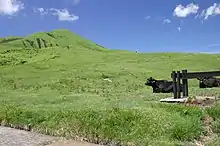 The Daihimonjiyaki (大火文字焼き) is part of the Noyaki (のやき, burning of the hills) that occurs in Aso, at the beginning of March every year. The hills are burnt to stop the growth of trees allowing the grass to take over, thereby maintaining Aso's famous grasslands.[17] The kanji (Chinese character) for fire Hi (火)、and the character for flame Hono (炎) is lit onto Ojo-dake and Motozuka (known locally as Kitazuka) which are two hills, on the second Saturday of March every year.[18] The symbol can be seen from the top of the caldera to the surrounding villages. Fireworks and market stalls are also planned as part of the overall festival.