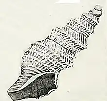 (Original description) The dull white shell is high, attenuate anteriorly. It contains six whorls, strongly angular, and including a smooth blunt two-whorled protoconch. A strong keel angles the periphery, another less strong halfway to the lower suture, and a third margins the suture. On the upper slope are two or more faint spirals. Numerous axial lirae cancellate the shell and pass over the keels, rendering them nodulous. They disappear on the lower part of the body whorl, which is occupied by about eight smooth spirals. The aperture is subquadrate, contracted in front to form a short open siphonal canal. The outer lip is strongly angled at the carena, forming a wide, triangular sinus; below corrugated by the sculpture. The inner lip is curved. [2]