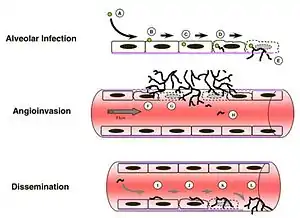 Immunosuppressed individuals are susceptible to invasive A. fumigatus infection, which most commonly manifests as invasive pulmonary aspergillosis. Inhaled conidia that evade host immune destruction are the progenitors of invasive disease. These conidia emerge from dormancy and make a morphological switch to hyphae by germinating in the warm, moist, nutrient-rich environment of the pulmonary alveoli.[11] Germination occurs both extracellularly or in type II pneumocyte endosomes containing conidia.[11][14] Following germination, filamentous hyphal growth results in epithelial penetration and subsequent penetration of the vascular endothelium.[11][14] The process of angioinvasion causes endothelial damage and induces a proinflammatory response, tissue factor expression and activation of the coagulation cascade.[11] This results in intravascular thrombosis and localized tissue infarction, however, dissemination of hyphal fragments is usually limited.[11][14] Dissemination through the blood stream only occurs in severely immunocompromised individuals.[14]