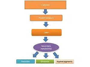 The lifecycle of filamentous fungi including Aspergillus spp. consists of two phases: a hyphal growth phase and a reproductive (sporulation) phase. The switch between growth and reproductive phases of these fungi is regulated in part by the level of secondary metabolite production.[41][42] The secondary metabolites are believed to be produced to activate sporulation and pigments required for sporulation structures.[43] G protein signaling regulates secondary metabolite production.[44] Genome sequencing has revealed 40 potential genes involved in secondary metabolite production including mycotoxins, which are produced at the time of sporulation.[9][45]