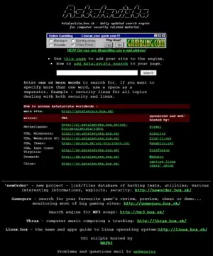 astalavista.box.sk was founded in 1994[1] as one of the first search engines for computer security information. In practice it turned out to be used as a search engine for security exploits, software for hacking, cracking and different keygenerators and software cracks.[2]