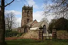 Adjacent to Aston Hall is the oldest surviving structure in the village, the Grade I listed Church of All Saints. It is built on the site of earlier church listed in the Domesday Book, and parts of it date to 12th, 14th and 15th centuries though with restoration works including rebuilding of the chancel in the 19th century. Monuments in the church include two wall plaques to William Mason a former rector of the church.[3][4] The old rectory building on Church Lane was also worked on by John Carr, it is named High Trees and is Grade II listed[5] as are a number of other 18th and early 19th century buildings along the main road (Worksop Road) including The Grange and South Farm.[6][7] To the north of these on Aughton Lane is the William Layne Reading Room, a building that was formally Aston Old School, founded in 1738, next to which stands a war memorial erected in 2011.[8][9]