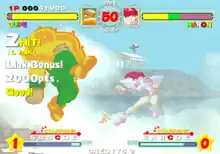 The objective of the airborne-based fighting game is to knock out the opponent in two out of three rounds (except the one round-only final boss fight). There are two modes in the original arcade version: "Story Mode" (1P-only) or "1P VS. 2P". In "Story Mode", at the beginning of each battle, the player must converse with the opponent by selecting one of three sentences. Depending on which sentence is selected, the CPU-controlled opponent will either "Heat Up" (become hard), "Cool Down" (become easy) or stay neutral before fighting (no difficulty change).