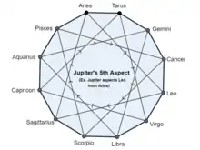 According to the Tajika System,[6] that in practice is applied more to Varshaphal (Annual Chart) or a query-chart (Horary astrology), the planetary aspect on the 5th and the 9th houses from itself is very strong, openly friendly and helpful, e.g. if the Sun is in Aries and Jupiter is in Leo both will aspect each other producing very favourable results. The aspect on the 3rd and the 11th is secretly friendly but very helpful with the former being stronger, e.g. if the Sun is in Aries and Jupiter in Gemini with both though aspecting each other the aspect of Sun will produce more favourable results than Jupiter. The aspect on the 4th and the 10th is secretly inimical, when planets forming such an aspect tend to produce bad results and cause disappointments, and on the 7th openly inimical, these aspects are unhelpful and often destructive. Tajika aspects are deemed effective within 12 degrees either side of the aspected point. This principle is followed by Western astrology. Benefic aspects cast on the 2nd and the 12th give happiness but inimical aspect on 6th, 7th and 8th and on itself cause many hardships. Aspects of partial strength are not generally taken into account.[7]