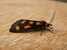 Asura cervicalis is a species of moth of the family Erebidae. It is known from the non-tropical parts of eastern Australia, including areas of New South Wales, Queensland and Victoria. The wingspan is about 15 mm (0.59 in). Adults are slim bodied and black with five yellow spots on each forewing. There is a large yellow patch on each hindwing.[2] The moths have sparse grey hairs. There are four tufts of long dense black hair projecting from the verrucae on the meso- and meta-thorax on each side. The larvae have been observed on Ficus, Acacia and Eucalyptus species. It is suspected of feeding only on the lichens on the trunks and branches of these plants. Pupation takes place in a thin cocoon of felted hairs, attached to a wall or tree trunk.