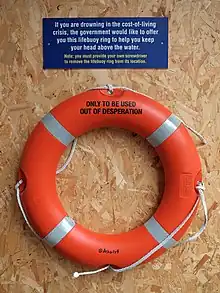 During July 2022, Athirty4 screwed a full-size lifebuoy to a wooden hoarding on Catte Street, Oxford, which drew attention to the UK's cost-of-living crisis. Above the lifebuoy, a sign read: “If you are drowning in the cost-of-living crisis, the government would like to offer you this lifebuoy ring to help you keep your head above the water. Note: You must provide your own screwdriver to remove the lifebuoy ring from its location.” [17]