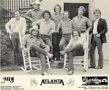 Atlanta was formed in 1982 by Brad Griffis (bass guitar), Bill Davidson (vocals, rhythm guitar), Tony Ingram (vocals, fiddle), Alan David (lead guitar), Allen Collay (keyboards), Bill Packard (keyboards), Jeff Baker (harmonica), Dick Stevens (bass), and John Holder (drums).[2] Prior to the foundation, Ingram had recorded on Epic Records in the band Spurzz,[2] and Stevens, Davidson, Griffis, and David had previously toured as a re-establishment of The Vogues.[3] The group was founded through the assistance of record producer Larry McBride, who had also launched the career of Alabama.[4] With nine members, Atlanta was the largest country music band at the time.[4]