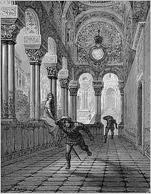Atlantes was a powerful sorcerer featured in chansons de geste. In Boiardo's Orlando Innamorato (1482), where he is known as Atalante, the magician fears that Rugiero (Boiardo's spelling) will convert to Christianity and aid Charlemagne against the Saracens. To prevent this and forestall Rugiero's death, he constructs a magic garden ringed by glass on Mt. Carena in the Atlas Mountains, after which he is named.[1] In Orlando Furioso, Atlantes' magical castle is filled with illusions, in order to divert Ruggiero (Ariosto's spelling) from what he has foretold as certain doom. Ruggiero is later set free by Bradamante and after numerous trials and quests sires a great line of heroes. He later dies betrayed fulfilling the destiny foretold by Atlantes.