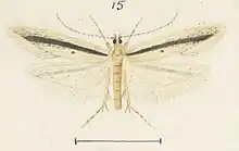 Male. — 20-21 mm. Head, palpi, and thorax light, fuscous, somewhat mixed with darker. Antennae light fuscous. Abdomen ochreous-whitish. Legs ochreous-whitish, anterior pair obscurely suffused with fuscous. Fore-wings elongate, narrow, costa slightly arched, distinctly sinuate in middle, apex round-pointed, hindmargin extremely oblique, slightly rounded ; light fuscous, sometimes slightly mixed with darker ; a straight narrow tolerably well-defined blackish longitudinal streak somewhat above middle from base nearly to apex, tending to be very slightly interrupted at 1⁄3 and 2⁄3 , rather suffused beneath towards apex and near base, sometimes entirely obsolete ; when obsolete, there are sometimes visible an arched fuscous mark before 1⁄3 and another just beyond middle, which are usually obscured by the streak ; a slender very obscure fuscous transverse line from 3⁄4 of costa to 3⁄4 of inner margin, twice angulated above middle, usually terminating the longitudinal streak, often obsolete : cilia light fuscous, with a cloudy blackish interrupted basal line. Hindwings whitish, slightly suffused with ochreous-grey towards costa ; cilia whitish, with faint cloudy grey basal and apical lines.[5]