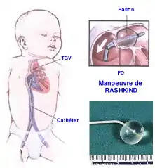 Atrial septostomy is a surgical procedure in which a small hole is created between the upper two chambers of the heart, the atria. This procedure is primarily used to palliate dextro-Transposition of the great arteries or d-TGA (often imprecisely called transposition of the great arteries), a life-threatening cyanotic congenital heart defect seen in infants. It is performed prior to an arterial switch operation. Atrial septostomy has also seen limited use as a surgical treatment for pulmonary hypertension.[1] The first atrial septostomy (then less precisely called a septectomy) was developed by Vivien Thomas in a canine model and performed in humans by Alfred Blalock. The Rashkind balloon procedure, a common atrial septostomy technique, was developed in 1966 by American cardiologist William Rashkind at the Children's Hospital of Philadelphia.