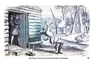 The next morning, either June 17 or 18, the band of about 30 Native Americans returned to their hidden positions and awaited the settlers.[2][5] When the settlers awoke, Brigham and Phillips went onto the porch of Ament's cabin where they conversed for a few minutes, failing to notice the moccasin tracks around the property. Phillips decided to go to his cabin, about a half mile (.8 km) from Ament's property, to finish a letter to his parents.[5] Brigham, intending to accompany Phillips, entered his cabin for a moment, and once inside he heard the sound of musket fire outside. Phillips, mortally wounded, fell to the ground, struck by two musket balls. The band of raiding Native Americans immediately descended upon him with their tomahawks.[2][6]
