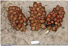 The fruit from the tree is popular in the creation of medicines, beauty aids, and beverages. The palm core can be harvested but its extraction often results in death and is therefore not able to be cultivated due to its importance in the local ecosystem on fauna. The fruit is composed of numerous woody oblong fruits looking similar to small coconuts.[6]