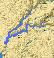 Filling the Auburn Reservoir would result in a two-pronged, 40-mile (64 km) lake which would inundate numerous canyons and rapids of the North and Middle Forks of the American River. In 1981, the American River was acknowledged as the most popular recreational river in California.[19] Over one million people visit the canyons of the North and Middle Forks of the American River each year to engage in various recreational activities, including kayaking, rafting, hiking, hunting, biking, horseback riding, gold mining, off-roading, and rock climbing. About 900,000 of these visitors go to the Auburn State Recreation Area, which includes the former dam site.[30] The reservoir would inundate most of the Auburn recreation area, although some new recreational opportunities such as boating, water-skiing and deep water fishing would be created as a result of the new lake. Many trails, including those used by the Tevis Cup and Western States Endurance Run, would be submerged.[31] The Auburn Reservoir would also result in the destruction of thousands of acres of riverine habitat,[31] and the inundation of historic and archaeological sites.[32]