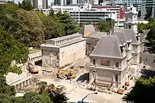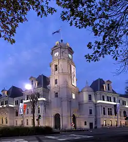 The main gallery building was originally designed by Melbourne architects Grainger & D'Ebro to house not only the art gallery but also the City Council offices, lecture theatre and public library. It is constructed of brick and plaster in an early French Renaissance style and was completed in 1887, with an extension built in 1916.[17] It is three storeys high, with an attic in the steep pitched roofs, and a six-storey clock tower. The building was registered as a Category I heritage item by Heritage New Zealand on 24 November 1983, listed with registration number 92.[18]