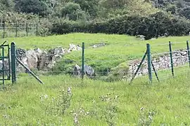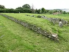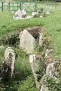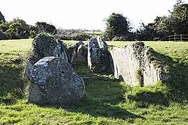 Audleystown court tomb is a dual-court tomb, with a layout which is unique to Ireland. Court tombs typically have a single courtyard and one gallery of compartmentalized burial areas, which are usually located at the wide end of the cairn. In dual-court tombs a court and a gallery are placed at each end of the cairn, as in Audleystown and Cohaw.[3] In 1952, as part of the Archaeological Survey of Northern Ireland, A.E.P ('Pat') Collins, conducted the first archeological excavation of the Audleystown tomb and published his findings in 1954. The Ministry of Finance assumed guardianship of the site and declared it an ancient monument. After the 1952 excavation, the burial galleries were filled with sand to protect the monument.[4]