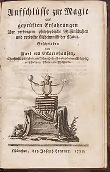 Aufschlüsse zur Magie aus geprüften Erfahrungen über verborgene philosophische Wissenschaften und verdeckte Geheimnisse der Natur, Erstes Buch (English: Insights into magic from tested experiences about hidden philosophical sciences and hidden secrets of nature, book one) is a theosophical work written by Karl von Eckartshausen and published in 1788 in Munich. It contains descriptions of diverse topics of natural philosophy and esotericism, drawing elements from Kabbalah and Hermeticism.