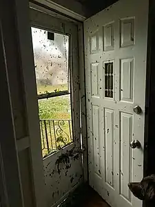 A front doorway in Marshalltown, Iowa with shredded foliage embedded throughout on August 10.