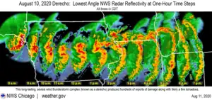The August 2020 Midwest derecho was a powerful derecho affecting the Midwestern United States on August 10–11, 2020, primarily eastern Nebraska, Iowa, Illinois, Wisconsin, and Indiana. It caused high winds and spawned an outbreak of weak tornadoes. Some areas reported torrential rain and large hail.[2][7][1]
