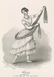 She made her Paris debut at age fourteen in November 1839 in Coralli's Le Diable boiteux.[6] The response to her debut was positive; Théophile Gautier referred to her as an "infant prodigy" and reviews described her dancing as "original," "eccentric," and "astonishing."[3] Much was made of the fact that she was born in the New World, with Parisian reviewers describing her as a "wild doe" or a "lively gazelle."[3] Two weeks later she performed in her second debut La Tarentule, a two-act ballet-pantomime, alongside Fanny Elssler.[3] Her third debut performance at the Paris Opéra was in December 1839 with an appearance in La Gypsy, a full-length ballet-pantomime with choreography by Mazilier.[3] That month she was offered a contract for an appointment at the Opéra, for a generous annual sum of 3,000 livres.[3]