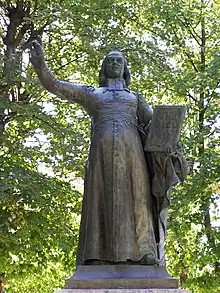 He called himself "Michaut des monnaies " (Michaut of the Mint )[20] for he did not wish to be mistaken for a general called Michaux who fought the Napoleonic Wars and lived rue de Vergennes too. He made a living out of annuities, rents from the various apartments he owned in Versailles and Paris and a 300 francs yearly housing pension he had been benefiting since 1832 emanating from the Fine Art and Science Office attached to the Ministry of Trade and Public Works. His friendship[21] with the Director of the Institute for the Deaf and Dumb, Desiré Ordinaire – who was an admirer of the Abbé Charles-Michel de l'Épée the founding father of free education for deaf and dumb children; he was also the inventor 1770, of the first language created based on a system of signs, – led him to produce his very last work . At first it consisted of a bust,[22] however Michaut's father long illness took him away him from this project for a while. But in 1839, he started circulating an effigy[23] of the Abbé he had executed . A commission was eventually constituted in Versailles, whose function was to supervise the making of " a monument à l'Abbé de l'Épée". Charles Michel de l' Épée was originally from Versailles and the monument was built to help raising funds for the Institute. He sculpted the statue and cast it into bronze at his own expense in 1843.[24] The Abbé is represented standing while holding in his left hand a tablet on which is carved the word DIEU (GOD). His right hand is raised up as his fingers are shaping what stands for a D in sign language .