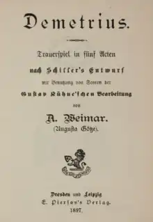 - Demetrius, tragedy in five acts, premiered Weimar 1893 (1897)