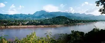Conquered and charmed, an impression remains with me: dry fishermen's nets strung up along scaffolding; boats pulled half out of the water onto the strand; rafts crossing noisily over the Nam Khan's rapids into the Mekong; white and gold pagodas roofed with coloured varnished tiles; tall houses built in wood and huts constructed with palm leaves, their roofs covered with thin strips of bamboo; lightly dressed men and women climbing up and down the muddy and steeply rising banks between small gardens and providing an appropriate splash of colour; as a final note, and not too far distant, high mountains, dark green in colour, with tufts of cloud rising from the Nam Khan and dispersing about them.
