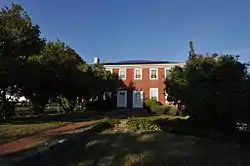 The Auld-McCobb House is set on a rise overlooking downtown Boothbay Harbor, near the center of a triangular block formed by Oak Street, McClintock Street, and Townsend Avenue. It is a large double-pile two story brick structure, with a hip roof and a rubblestone foundation. Its front facade faces roughly west, and is six bays wide. The bays are symmetrically arranged, with two entrances in the center bays, with simple surrounds. Ground-floor windows are twelve-over-twelve sash, and second-floor windows are twelve-over-eight sash, all set in rectangular openings with similar simple trim.[2]