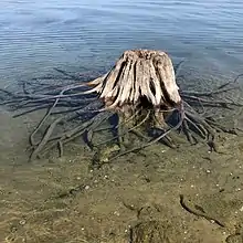 The stump of a tree sitting under the water of the St. Lawrence at the site of the former village of Aultsville, Ontario