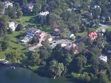 ![]() Aerial view of Aurora from south by southwest, 2013. The village is along the straight stretch of the Cayuga Lake shore just above lower right of photo. | |