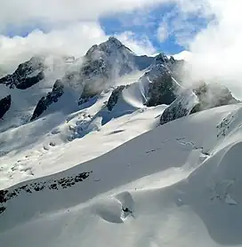 Austerity Mountain is the second-highest point of the Adamant Range which is a subrange of the Selkirk Mountains, and it ranks as the fifth-highest peak in the Selkirks.[1] It is located 81 km (50 mi) northwest of Golden and 30 km (19 mi) north of Glacier National Park. Austerity is highly glaciated with the Granite Glacier to the north and Austerity Glacier to the south. Precipitation runoff and glacial meltwater from the mountain's slopes drains into tributaries of the Columbia River.[1] Topographic relief is significant as the summit rises 1,700 metres (5,577 ft) above Austerity Creek in 5 km (3.1 mi) and 2,600 m (8,530 ft) above Kinbasket Lake in 15 km (9.3 mi).