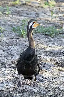John Gould described the Australasian darter as Plotus novaehollandiae in 1847.[2] Closely related to American (Anhinga anhinga), African (Anhinga rufa), and Oriental (Anhinga melanogaster) darters, the Australasian darter has been classed as a subspecies of the African or African plus Oriental darters. All four have also been classed as a single species. Examination of the leg bones indicates the three Old World species are more closely related to each other with the American species more divergent.[3] Genetic analysis showed it differed from A. rufa to a degree equivalent to that between other separate species, and shifted consensus to treating the Australasian darter as a separate species.[4][5]