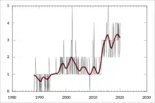 Australia has increasingly become a popular study destination for Kenyan students due to the attractiveness of their student visas and the accessibility of Australian tertiary education for foreign students.[2][28] In 2019, there were 3,426 Kenyan students enrolled at Australian universities.[29] This was almost a 60% increase from the 2014 enrolments five years prior.[29] Australia's student visa arrangement allows Kenyan students to work part-time while they study, and stay on in Australia after their degree to work for some time.[2][28] There are over 700 scholarships, fellowships and grants offered to Kenyan students at Australian universities.[30]