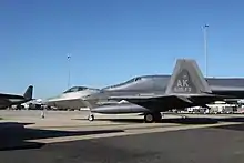 F-22 Raptor of the USAF on static display in 2011. A B-1B Lancer is in the background
