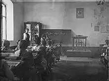 The occupational authorities considered Serbian national consciousness an existential threat to Austria-Hungary. Thus, the policies of the Military Governorate were aimed at depoliticising and denationalising the Serbian population.[84] Public gatherings and political parties were banned, the Cyrillic script was termed "dangerous to the state" (German: staatsgefährlich) and banned from schools and public spaces, streets named after people perceived as being significant to Serbian national identity were renamed, the wearing of traditional Serbian clothing was proscribed and the Gregorian calendar replaced the Julian. Additionally, all Serbian students had to be educated in the German language, according to Austrian academic standards and through teachers imported from Austria.[85]