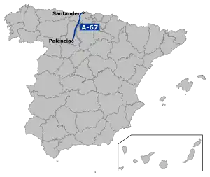 The Autovía A-67 is a highway in north west Spain. It connects the Cantabrian Atlantic Coast at Santander to Palencia. It follows the route of the N-611.