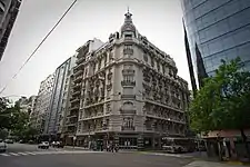 The avenue crosses pedestrianized Florida Street a few blocks on. The southeast corner of this intersection is known for the Galerías Pacífico shopping arcade, housed in ornate structure occupying a city block and built in 1889 as the Buenos Aires affiliate of Paris' renowned Bon Marché. The eclectic Beaux-Arts structure is complemented by the Naval Officers' Association building, on the intersection's northeast corner; adjacent to the latter building is Harrods Buenos Aires, currently undergoing renovations.[3] Writer Jorge Luis Borges frequented the Café St. James nearby (at Córdoba and Maipú), where he held his lectures on English literature during the 1950s and 1960s. One block west is the eclecticist Bencich Building, known for its tapered red cupola. Buenos Aires' Nueve de Julio Avenue (one of the world's widest) was extended northwards past Córdoba Avenue in the 1950s, and the intersection of the two avenues was graced by the placement of two fountains originally located at the Plaza de Mayo. Italian automaker FIAT opened the Mirafiori Tower, its Argentine headquarters, at this intersection in 1964.[1][2]