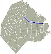 The 8 km (5 mi) avenue demarcates a number of Buenos Aires' boroughs. At its outset, it separates Retiro to the north from San Nicolás and, further west, from Balvanera. It then separates Balvanera from Recoleta, to the north and, further west, Palermo from Almagro and Villa Crespo (both to Palermo's south). Entering Villa Crespo, the avenue passes under Reconquista Bridge, an overpass opened in 1969 to facilitate traffic along Juan B. Justo Avenue. Córdoba Avenue's Villa Crespo section is known for its many apparel and footwear stores.[5] The avenue ends as such at Federico Lacroze Avenue, though geographically it continues as Giribone Street for another eight blocks, extending well into the Chacarita borough.