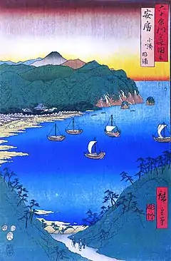 Awa Province (安房国, Awa-no kuni) was a province of Japan in the area of modern Chiba Prefecture.[1] It lies on the tip of the Bōsō Peninsula (房総半島), whose name takes its first kanji from the name of Awa Province and its second from Kazusa and Shimōsa Provinces. Its abbreviated form name was Bōshū (房州) or Anshū (安州). Awa Province in Shikoku phonetically has the same name, but is written with different kanji (阿波国). Awa is classified as one of the provinces of the Tōkaidō.[1] Under the Engishiki classification system, Awa was ranked as a "middle country" (中国) and a "far country" (遠国).