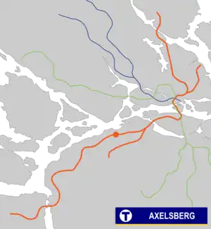 Axelsberg metro station is a station on the red line of the Stockholm metro, located in Axelsberg in the district of Hägersten. The station was opened on 16 May 1965 as part of the extension from Örnsberg to Sätra.[3] The distance to Slussen is 6.4 km.